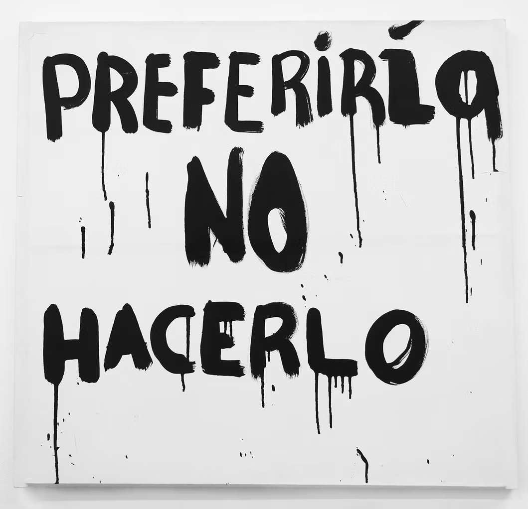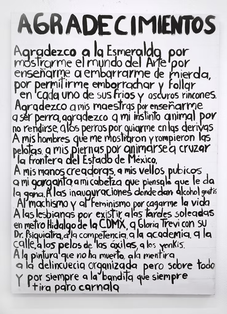 Sus pinturas abundan en la ignominia visual, con gestos discursivos que abordan lo confesional desde lxs feminismxs. usa la letra como elemento visual.